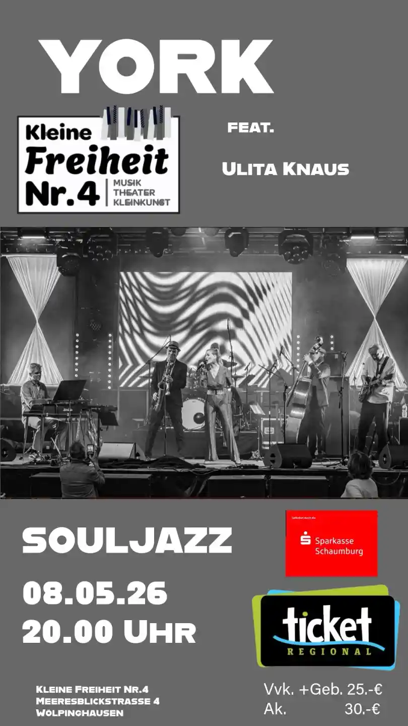 Der Fokus dieser Band liegt auf groovig tanzbarem Jazz – mehr für’s Bein als für den Kopf! Jahrelang war der Multi-Instrumentalist, Komponist und Produzent als gefragter Sideman an Saxofon und Flöte live und im Studio für etablierte Szene-Schwergewichte wie Randy Crawford, Phil Collins, Mousse T., Jazzkantine, Bahama Soul Club oder Spice tätig. Parallel dazu arbeitete er an eigenen Projekten wie dem deutsch-afrikanischen Projekt »Culture Clan« mit dem er in Südafrika einen Nr. 1 Hit landete und ausgezeichnet wurde. Ausgelöst durch die Pandemie realisiert YORK nun seine Vorliebe für Jazz und Soul mit dem Album »The SoulJazz Experience«. Mit Einschüben und Samples aus dem 60er-Jahre-Filmmusikflair stellt er einen Bezug zu seinem Schaffen in Theater und Film her und zeigt mit Scratches seine heimliche Liebe zum DJing. Seine langjährige Erfahrung auf der Bühne sowie Mitarbeit an über 100 CD-Produktionen, verschaffen ihm eine wie selbstverständlich wirkende Souveränität. Beeindruckend ist die stete Balance zwischenmusikalischer Akkuratesse und dem Mut zur analogen Spiellücke. YORK genießt hör- und spürbar seine neuen kreativen Freiheiten. Dies gleichermaßen als Komponist, Arrangeur, Produzent – wie natürlich auch als ausführender Musiker! Und nun mit einer hervorragenden live Band! MUSIKER: Sax/Flute York Ostermayer Git. Ralph König Bass. Christian Decker Drums Kristof Hinz Keys Martin Meyer Voc. Ulita Knaus